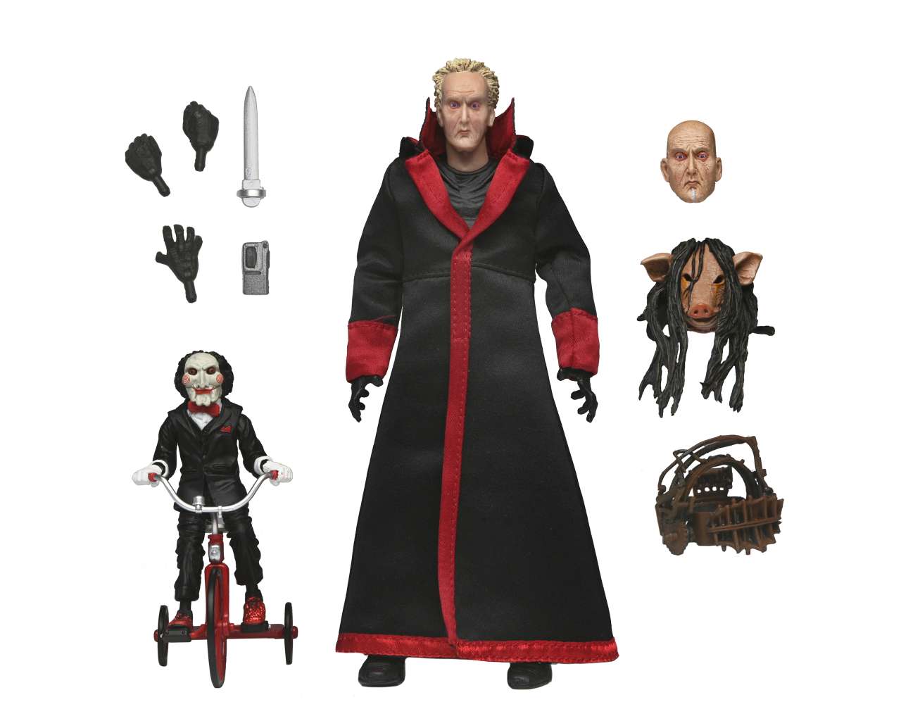 Dalla serie Saw, ecco l'action figure Ultimate del Jigsaw Killer in versione Black Robe! La figura è super dettagliata e ha un soprabito in vera stoffa. Nella scatola troverete tantissimi accessori: maschera da maiale, mani intercambiabili, il pupazzo Billy sul triciclo e altro ancora!