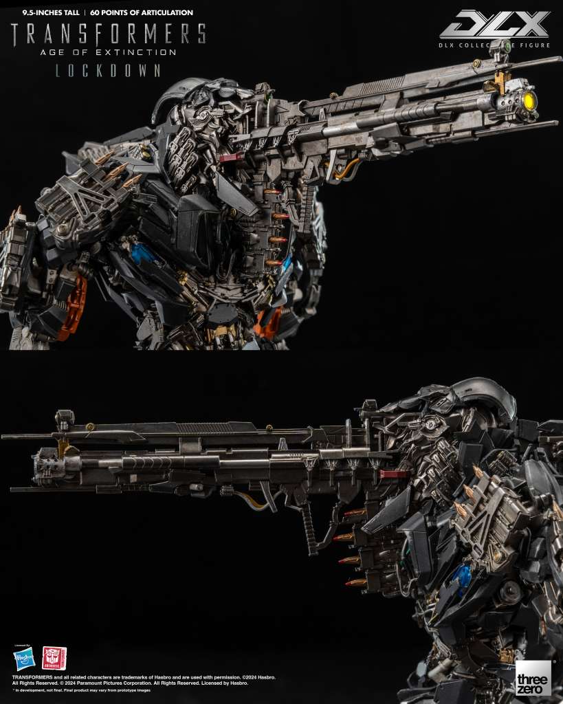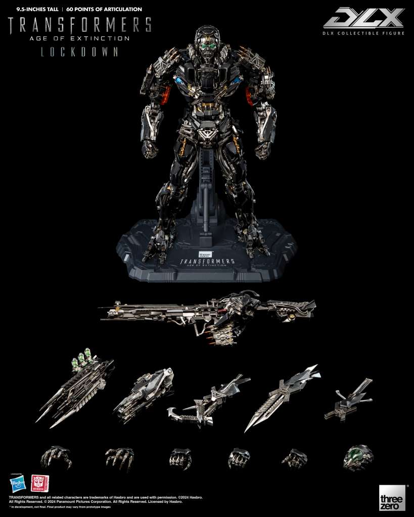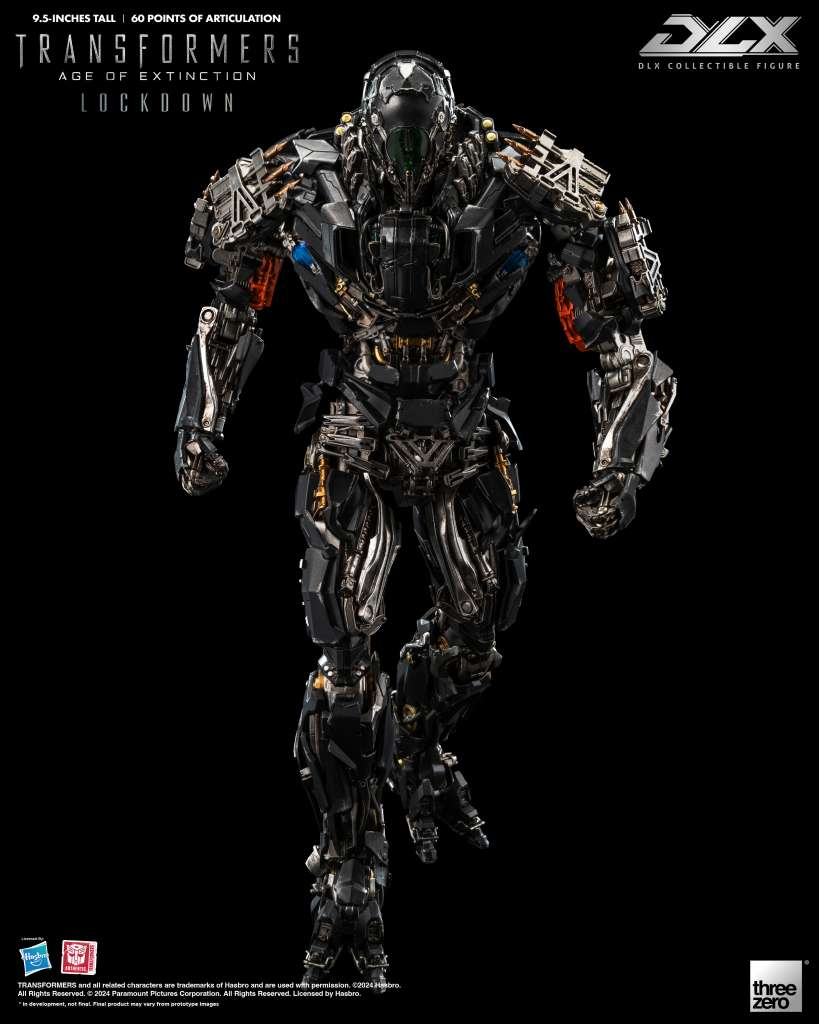 Alto circa 24 cm, Lockdown ha circa 60 punti di articolazione e presenta parti in metallo pressofuso con una struttura in plastica, che consente una gamma dinamica di pose, durata eccellente e stabilità. DLX Lockdown è dotato di una scultura incredibilmente dettagliata con l'applicazione di verniciatura con agenti atmosferici tipica di Threezero per replicare l'aspetto visto nel film. I suoi occhi sono dotati di effetti luminosi a LED (richiede batterie AG13 x 2, non incluse). Gli accessori includono una Maschera da battaglia con pezzo trasparente, un Cannone facciale, un Estrattore di scintille, un Blaster, un Gancio, una Lama da braccio e un Coltello.