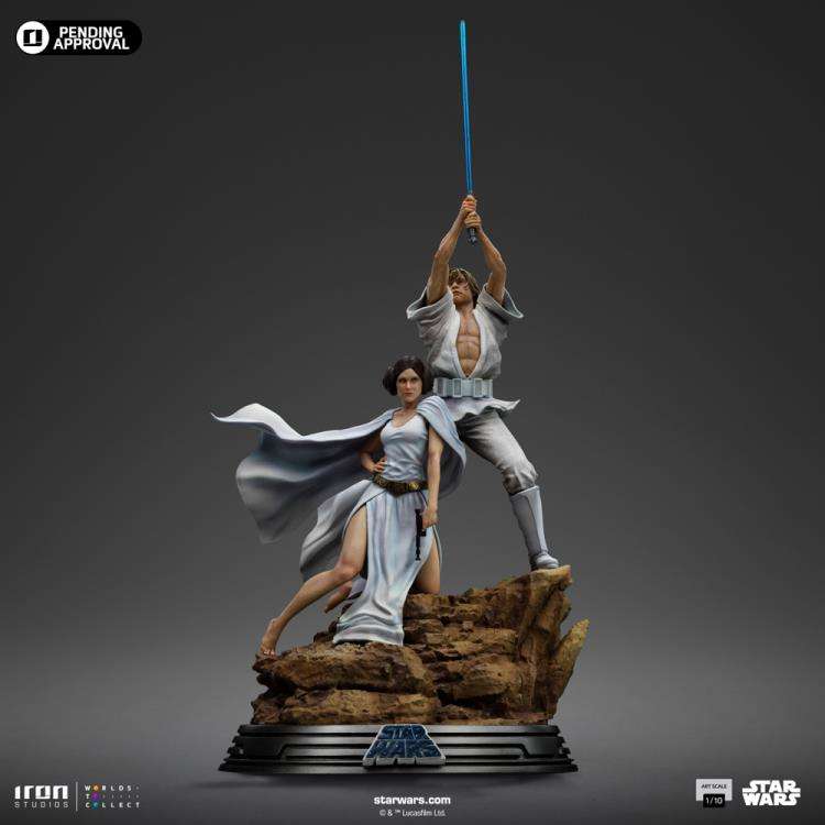 Basata sull'iconica locandina del film Star Wars Episodio IV: Una nuova speranza, il primo vero mitico "guerre stellari", questa statua deluxe in scala 1/10 porta in vita Luke e Leia con una scultura dipinta a mano, dettagliata e dotata di spade laser intercambiabile!
