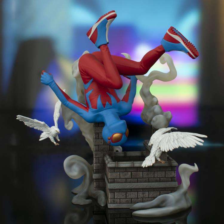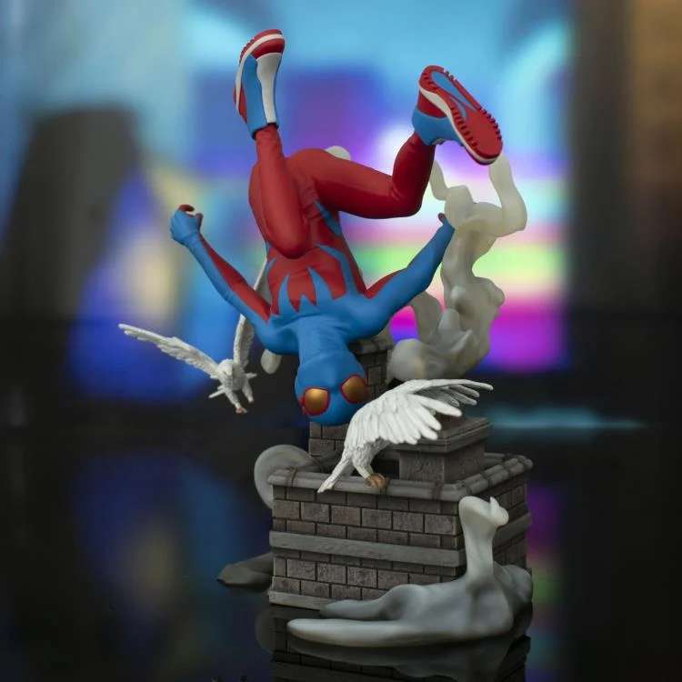 Il giovane eroe Spider-Boy vola su un tetto di New York City in questo nuovissimo Gallery Diorama di DST! Circondato da piccioni svolazzanti, Spider-Boy misura circa 8” di altezza ed è realizzato in PVC di alta qualità. Questa statua è caratterizzata da una scultura altamente dettagliata ed arriva in un box a finestra.