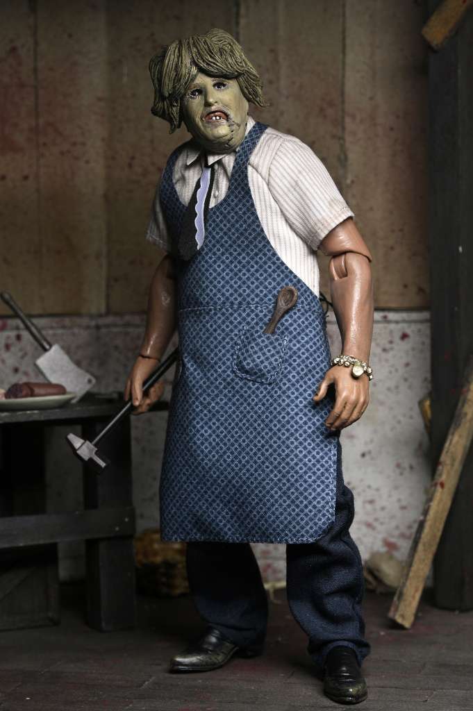 Neca presenta una nuova action figure Clothed di Leatherface con Old Lady Mask! La figura ha abiti in vera stoffa ed è dotata di accessori: mano intercambiabile, piatto, coltelli e altro ancora!
