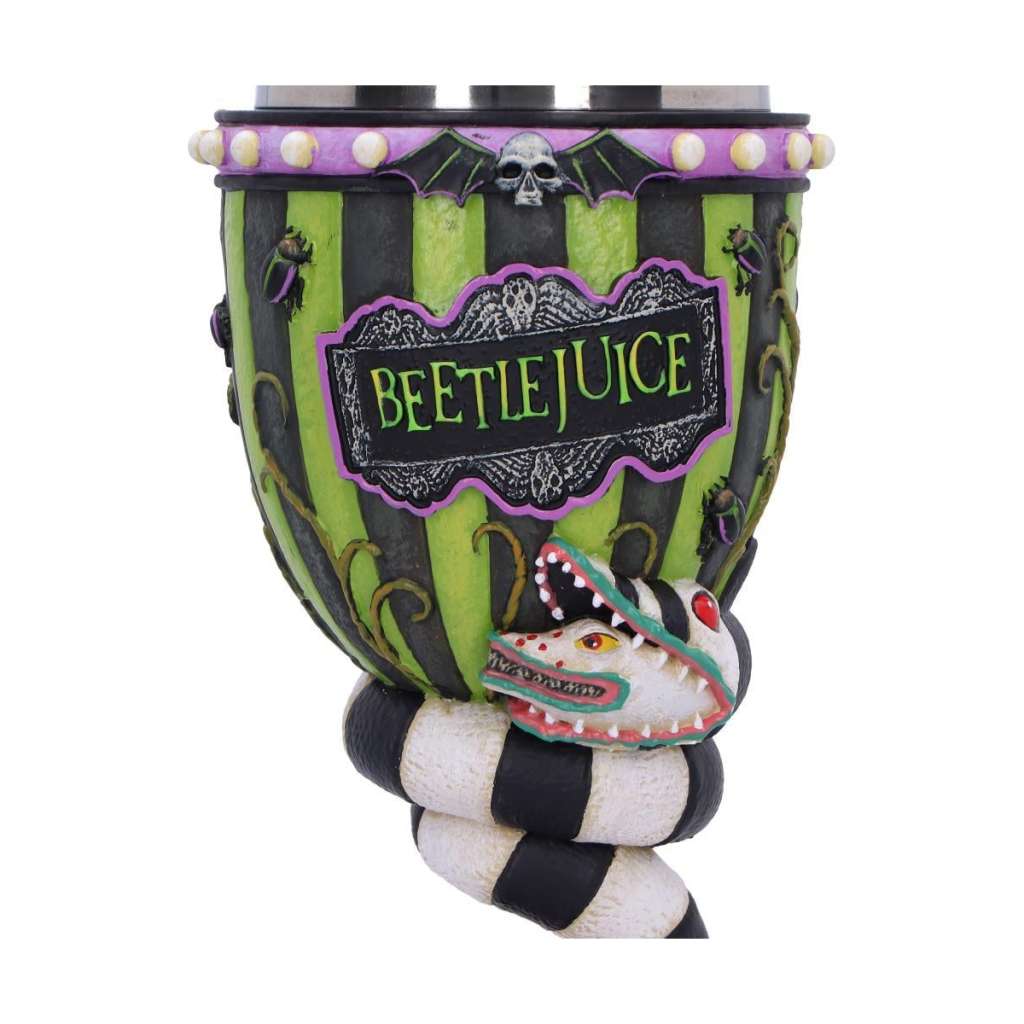 Calice Beetlejuice Calice da collezione con licenza ufficiale a tema Beetlejuice, ispirato all'iconico film di Tim Burton del 1988, perfetto per gli amanti del brivido e dello strano. Il calice presenta un design scolpito e dettagliato con colori vivaci, una base in resina con il verme delle sabbie a due teste avvolto attorno al manico e un interno in acciaio inossidabile per un uso funzionale e decorativo. Il calice è confezionato in una scatola espositiva con licenza ufficiale, decorata con l'immagine di Beetlejuice e con inserti protettivi in schiuma per evitare danni durante la spedizione. Il calice è perfetto per i collezionisti di cimeli cinematografici, i fan di Beetlejuice, gli amanti dell'arredamento gotico e gli amanti di Halloween.
