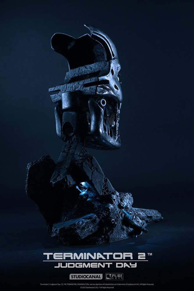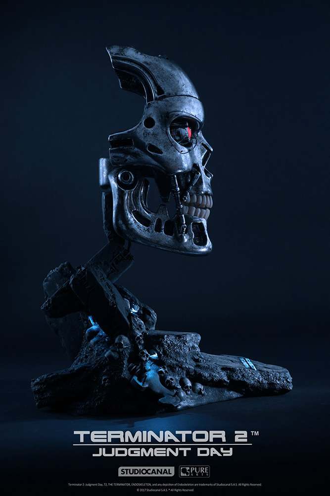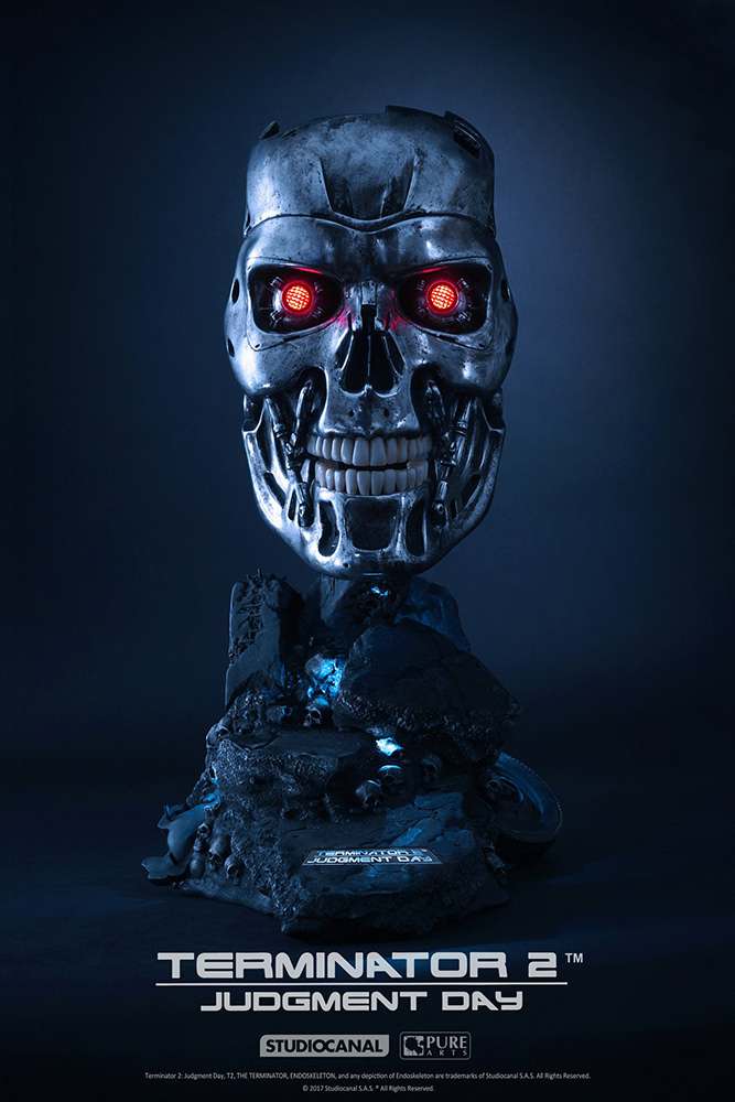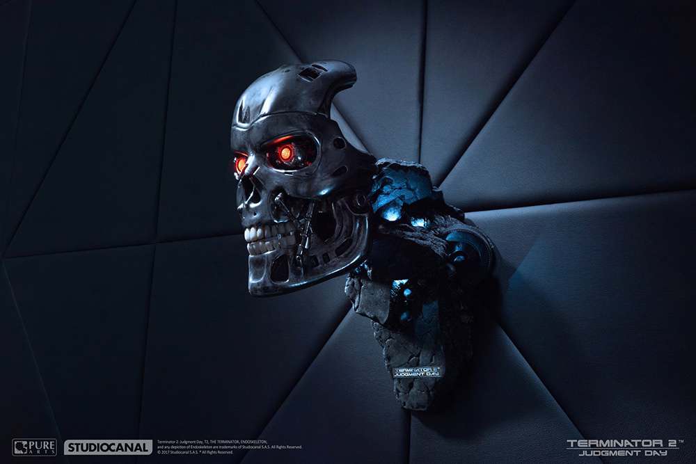 Un pezzo davvero imperdibile questa machera (non indossabile!) deidicata al T-800 direttamente dalla pellicola TERMINATOR 2. La scultura misura 45cm, in resina, con Luci LED, limitata ad 800 pezzi. Potrete esporla su piedistallo o appesa alla parete. (necessita di 3x batterie AA non incluse)