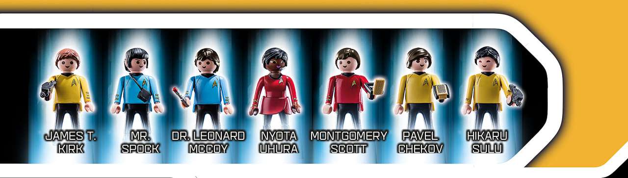 Personaggi Playmobil di tutto l'equipaggio: il capitano James T. Kirk, il signor Spock, il dottor Leonard "Bones" McCoy, Montgomery Scott, Nyota Uhura, Hikaru Sulu e Pavel Checov, tutti con molti accessori.