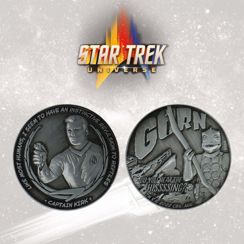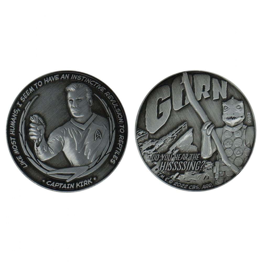 Celebra l'epico combattimento tra il Capitano Kirk e Gorn su questa moneta da collezione a doppia faccia. Limitata a soli 9.995 esemplari in tutto il mondo e numerata individualmente, questa moneta ha un diametro di 38 mm ed è fornita in una coppa acrilica protettiva e in una confezione da esposizione.
