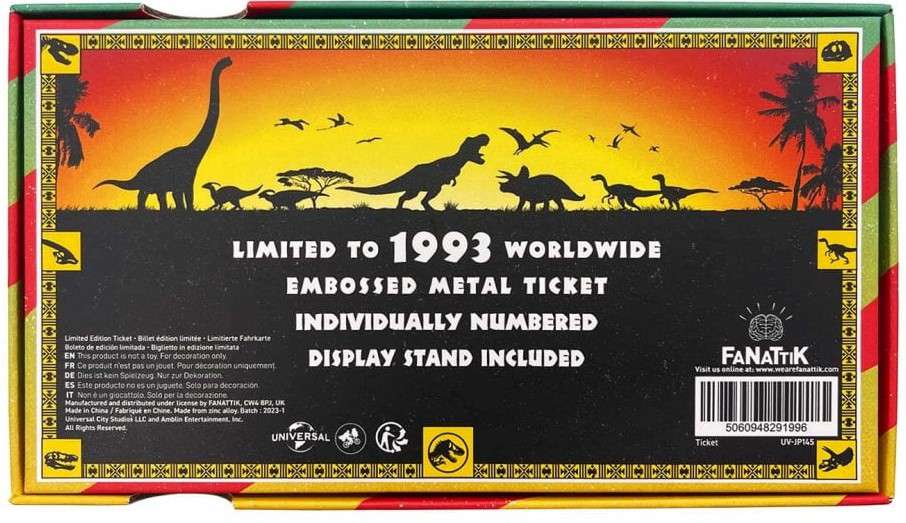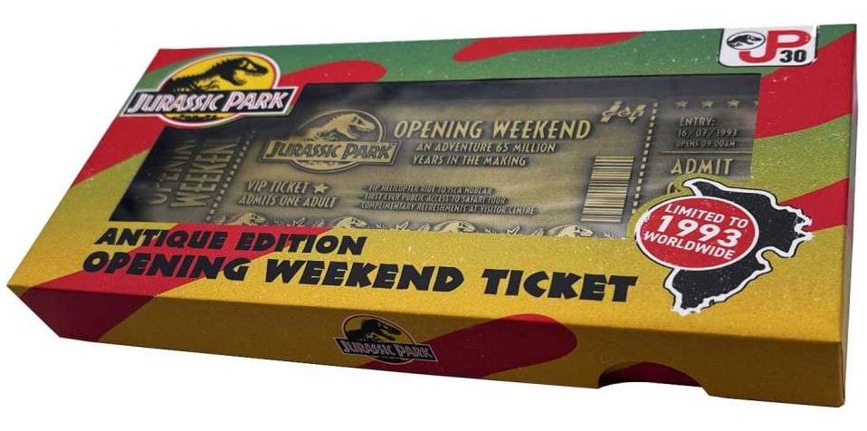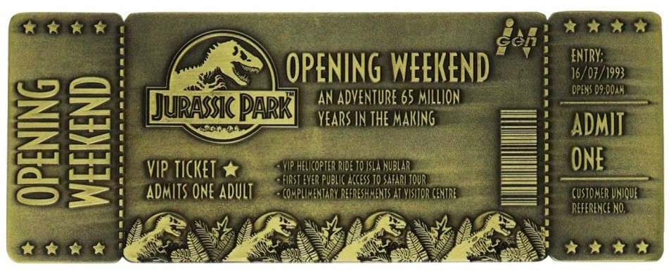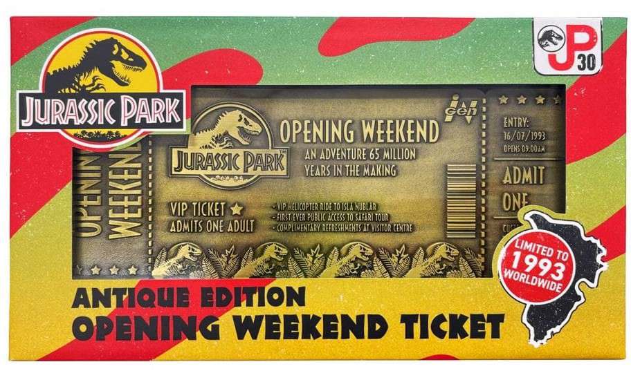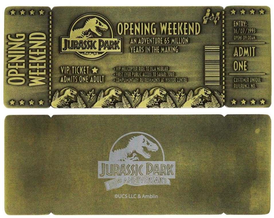 Celebrate il 30° anniversario di Jurassic Park con questa replica in metallo del Biglietto di Ingresso al Parco per il Weekend di Inaugurazione, limitata a soli 1993 esemplari numerati in tutto il mondo! La replica viene fornita con una basetta da esposizione all'interno della confezione.