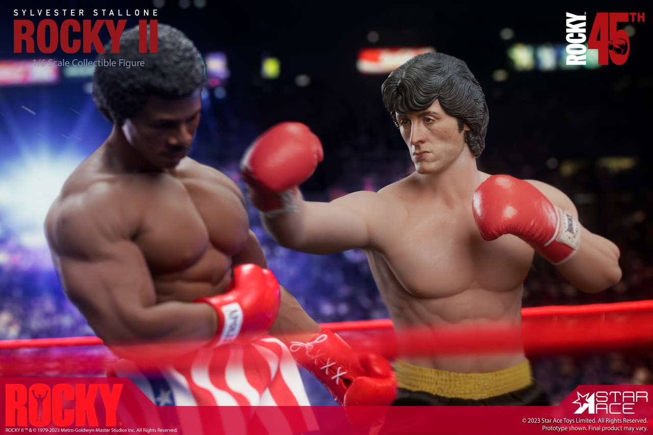 Questa figura 1/6 presenta una testa scolpita con un'autentica somiglianza a Rocky Balboa ed arriva con la cintura da campione, lo sgabello d'angolo, un secchio, mani e guantoni da boxe intercambiabili.