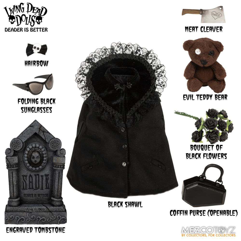 Sadie features 18 points of articulation and 5 interchangeable hands which allow for a multitude of devilish display options. She comes complete with a personalized, engraved tombstone, a coffin purse, bouquet of black flowers, meat cleaver, and a matching heterochromatic teddy bear that she can cuddle in her crypt.