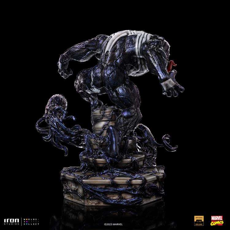 Above a metallic technological structure, the terrible and lethal villain moves forward, stomping and breaking a cylindric structure with green stained-glass, with the viscous tar mass escaping between the fissures. Taking the shape over the outlines of his host’s big muscles, covered by a complex network of veins and arteries of this dark substance, the monstrous creature forms a shape tensioning big claws in the tips of his fingers and threatening any adversary while he opens his big jaws, exposing his sharp fangs and a large viscous tongue.