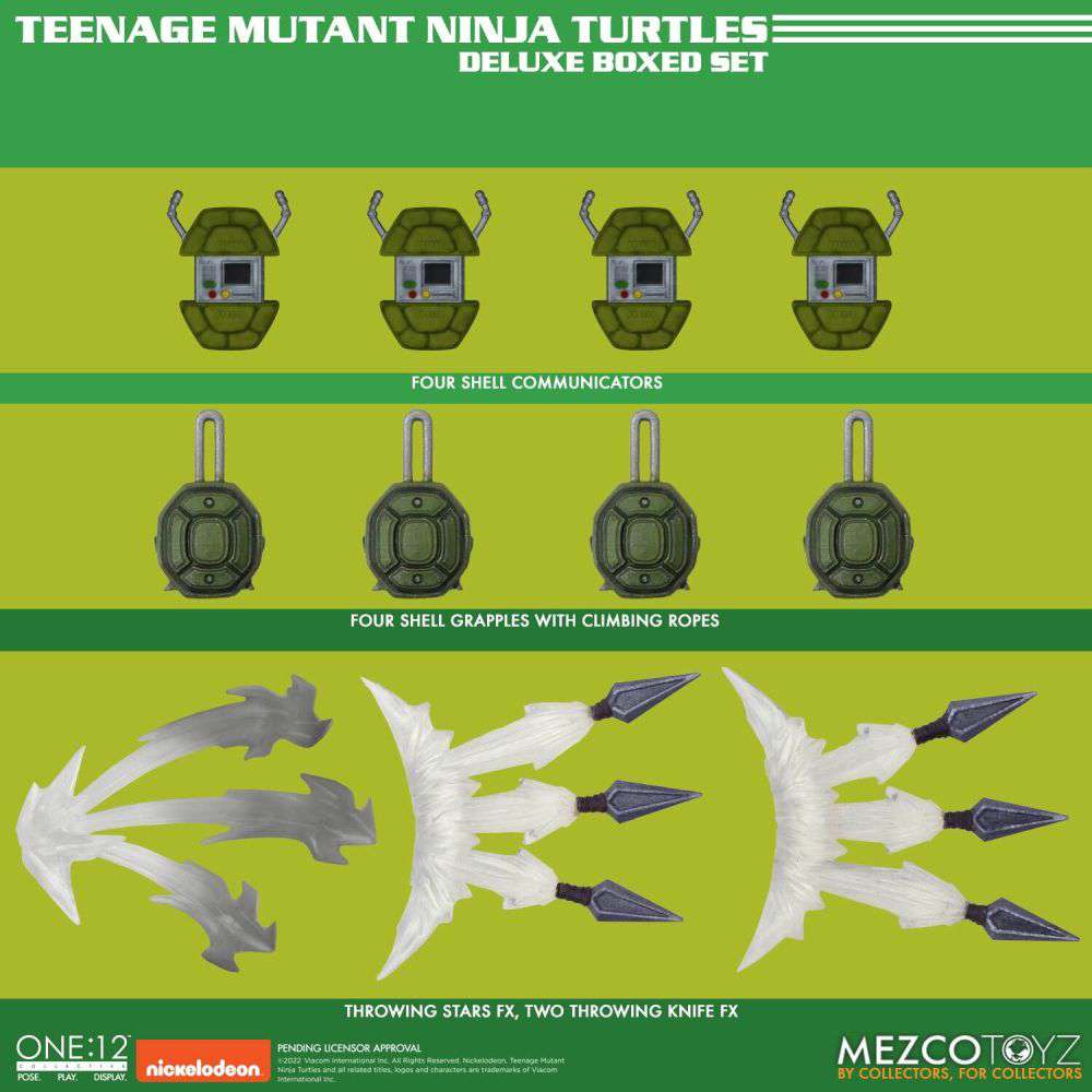 Mezco presenta un fantastico Box Set Deluxe per la serie One12 Collective dedicato alle Tartarughe Ninja. Nel set troverete le action figures delle 4 Tartarughe con una marea di accessori: abiti in vera stoffa, armi, maschere, mani intercambiabili e altro ancora!