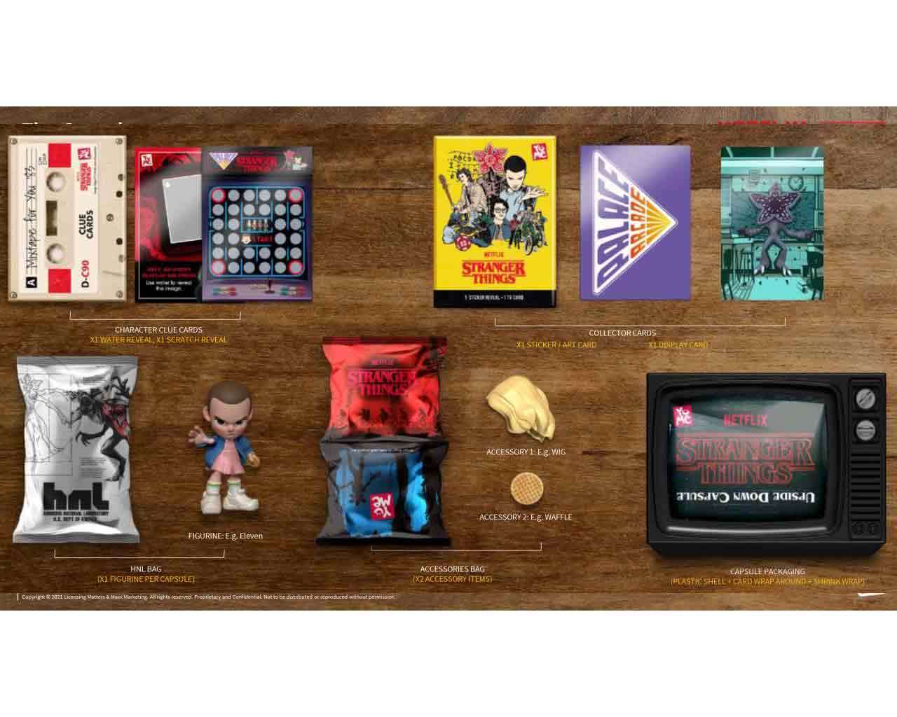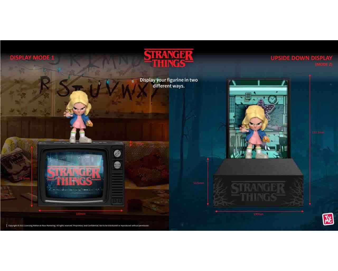 La Blind Box stessa verrà usata come basetta espositiva per il personaggio, che potrà essere esposto in due modi, o su un televisore con il logo "STRANGER THINGS" o creando un mini diorama utilizzando la Display Card.