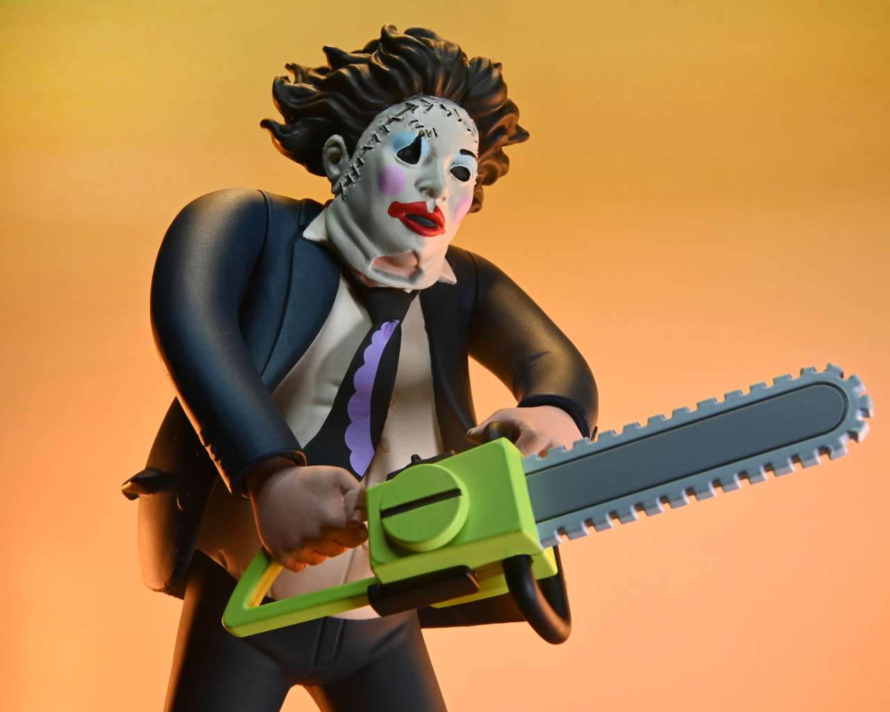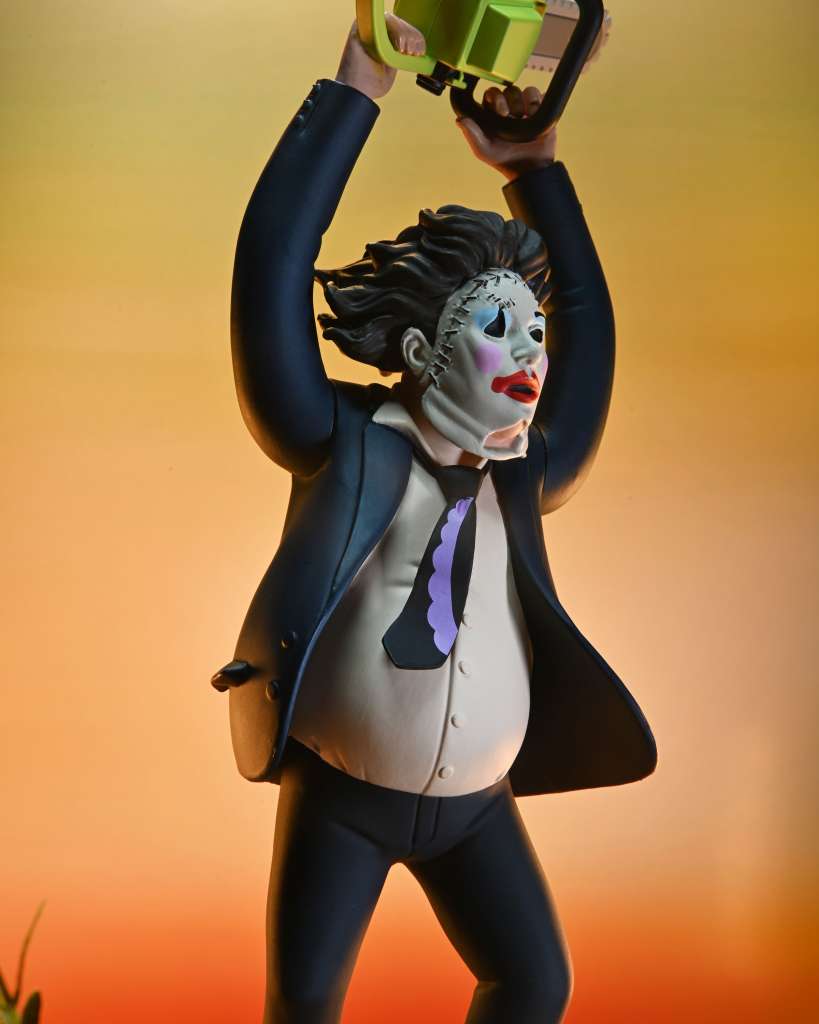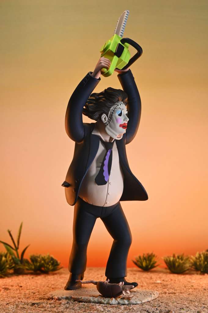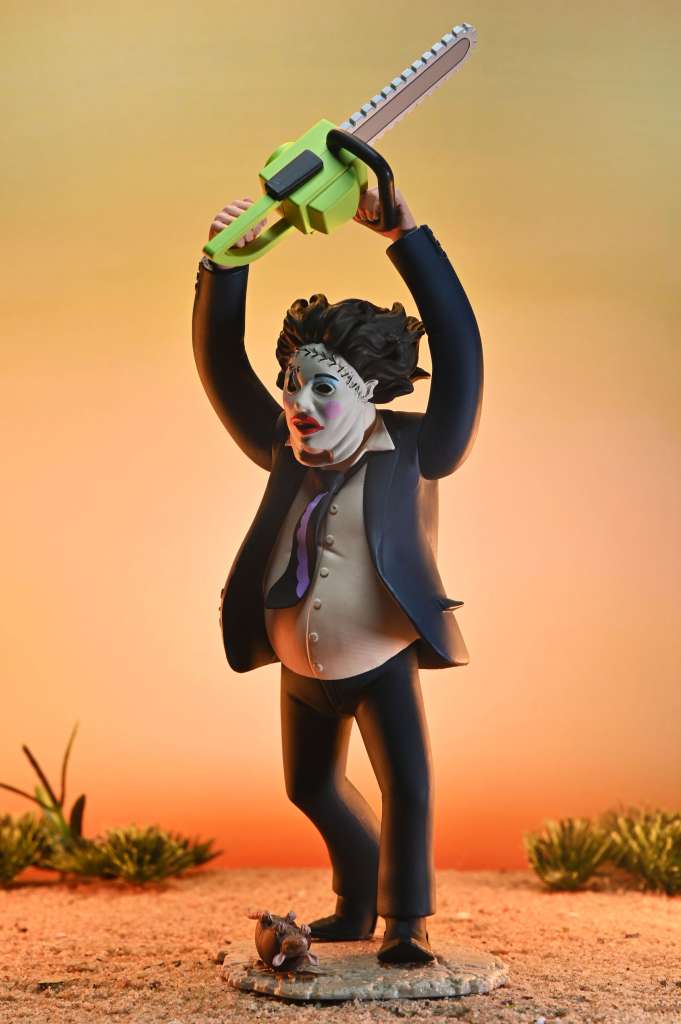 Dal classico film del 1974, in tempo per il cinquantesimo anniversario,  arriva questa versione di Leatherface per la linea Toony Terrors di NECA, che include simpatici mostri e assassini stilizzati con simpatia!