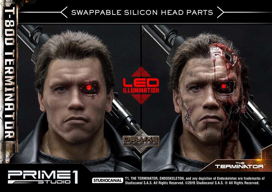 Da Prime 1 Studio la statua scala 1/2 di T-800 dal film Terminator. La statua in materiali di alta qualità è realizzata con estrema cura e attenzione ai dettagli: armi perfettamente riprodotte, accessori removibili, Led luminosi, e base a tema. La statua arriva in due edizioni, regolare e deluxe.