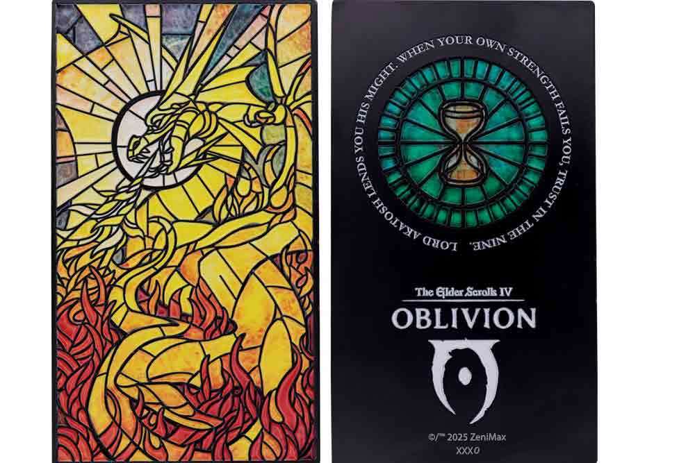 The head deity of the Divines, Akatosh is the Dragon God of Time and is mentioned in every Elder Scrolls game, including The Elder Scrolls IV: Oblivion, and is depicted on this ingot in the style of a stained glass window. It measures 100 x 56.8mm, is finished in black nickel with coloured details, and comes with a display stand inside its presentation box.