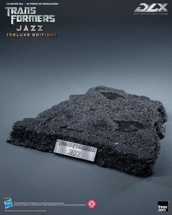 Standing approximately 19 cm (7.5 inches) tall, the DLX Jazz features a die-cast alloy internal frame that delivers substantial weight and a premium feel. Equipped with approximately 65 points of articulation, it achieves excellent balance and smooth dynamic posing. Multi-layered paint applications, combined with threezero’s signature distressed weathering techniques, carefully reproduce mechanical abrasions for authentically realistic, movie-accurate textures. The lower torso features a detachable design, allowing to equip the Deluxe Edition's exclusive damaged spine accessory, which captures Jazz’s heroic last stand against the Decepticons as depicted in the film.
