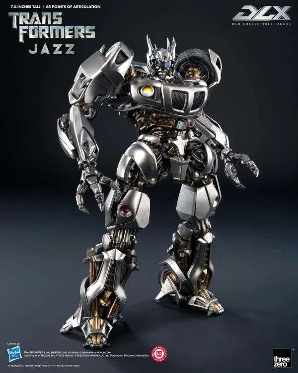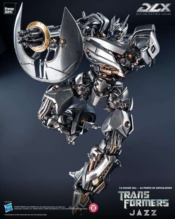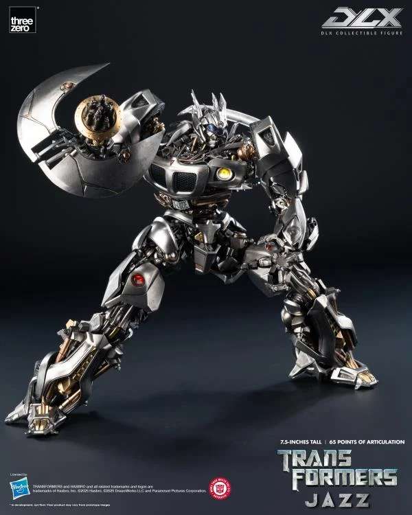 From the live-action film Transformers (2007), Jazz – Optimus Prime’s second-in-command – makes his debut in the threezero DLX series! Meticulously crafted by threezero’s new R&D team, this figure stays true to the movie’s design while adding excellent tactile quality and high playability to the legendary character. This Deluxe Edition exclusively includes a damaged spine, a set of seven-piece interchangeable battle-damaged outer-armor, and a diorama base.