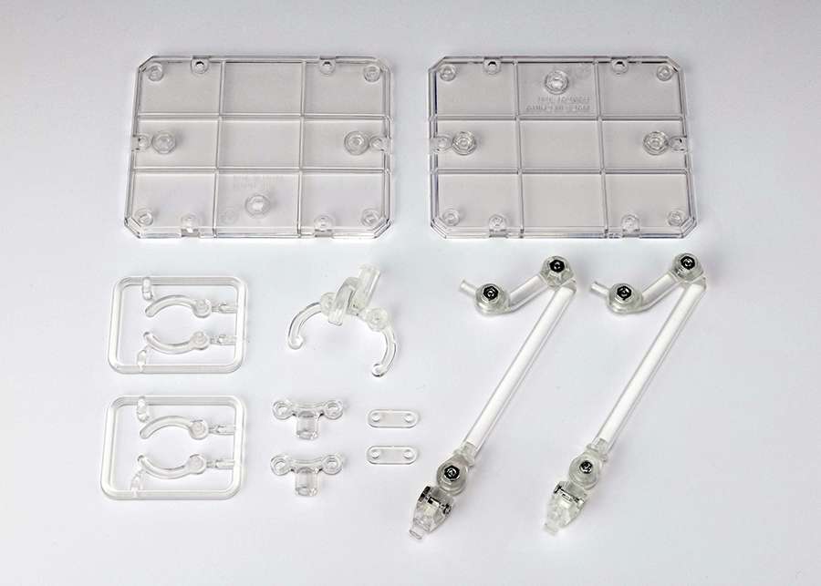 The set includes stand bases x 2, articulated support arms x 2, joints x 2, articulated clips and joints x 2, clips for figuresx 2, triple jointed support clip base.