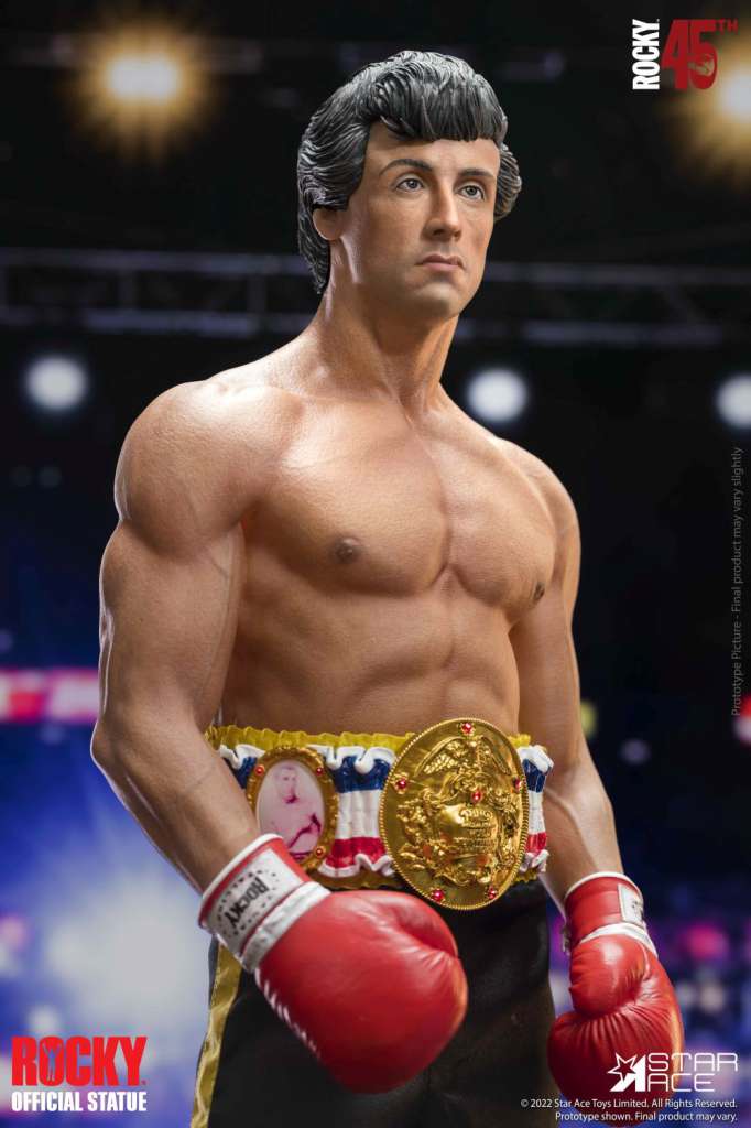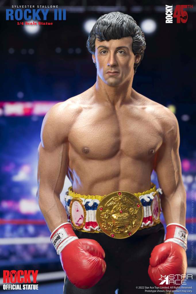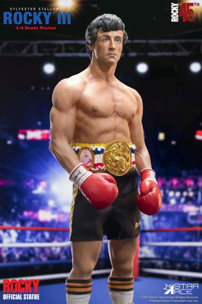 To celebrate the 45th Anniversary of Rocky, Star Ace brings the boxer to life in this ¼ scale mixed media/polyresin statue featuring his look from Rocky III. This mixed media statue features real fabric boxing shorts and a detailed and accurate likeness of Sylvester Stallone as Rocky with his leaner, more cut look from the third film in the series.